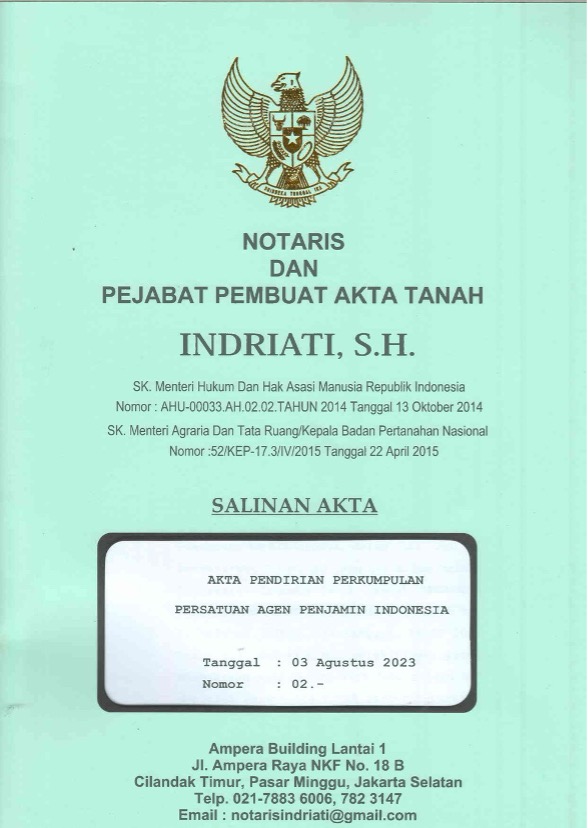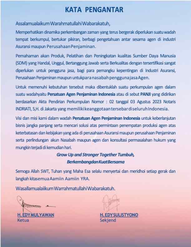 Persatuan Agen Penjamin Indonesia atau di sebut PANJI yang didirikan berdasarkan Akta Pendirian Perkumpulan Nomor : 02 tanggal 03 Agustus 2023 Notaris INDRIATI, S,H. di Jakarta yang memiliki keanggotaan tersebar di seluruh Indonesia.